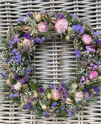 Mit verschiedenen Trockenblumen oder Blumen die schön eintrocknen , werden wir zusammen ein Kranz binden .