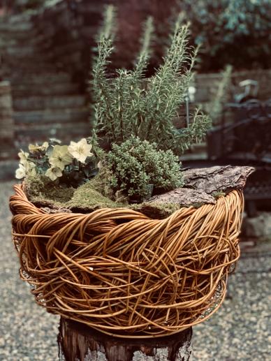 Frische Weide wird mit der Chaos flecht Technik zu einem Pflanz-Korb geflochten