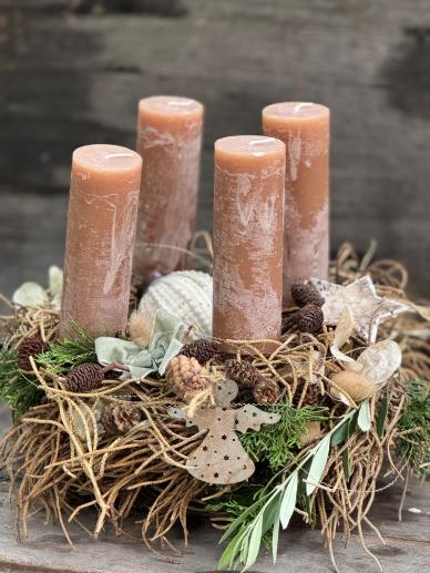 Verschiedene Kerzen wie Stumpen oder klassische Stabkerzen sind vor Ort vorhanden, um den Kranz individuell zu gestalten.